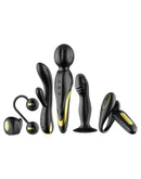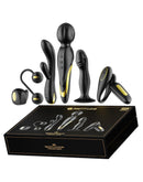 Das Black & Gold Luxe Vibrator Kit enthält 12 Spielzeuge mit Vibration, Lecken, Saugen, kabelloser Fernsteuerung und Elektrostimulation! Viele Toys sind mit 18k oder 24k Gold verziert. Alle Toys sind aus Silikon und die vibrierenden Toys sind per USB wiederaufladbar.