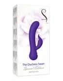 The Duchess Swan Special Edition has two independently controlled vibrations. Each vibration source offers 7 vibration functions with 3 speeds and 4 patterns. Product Specifications Details: Waterproof, travel-ready, phthalate-free Finish: 100% seamless silicone Usage time: Up to 4 hours Charging time: 3 hours Battery: Rechargeable Lithium-Ion pleasure technology: 2 independently controlled vibrations
