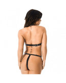 Ensemble de bikini ouvert en croûte de cuir, réglable en taille unique. Le string et le soutien-gorge sont tous deux réglables à l'aide de boucles métalliques.